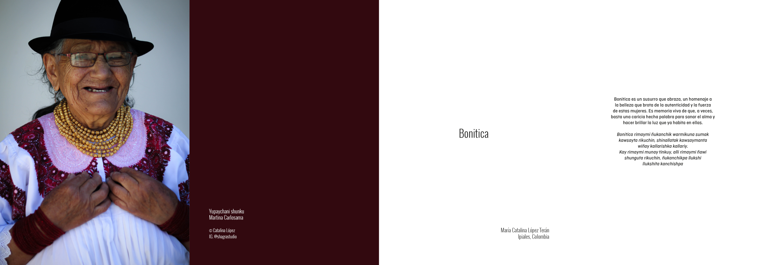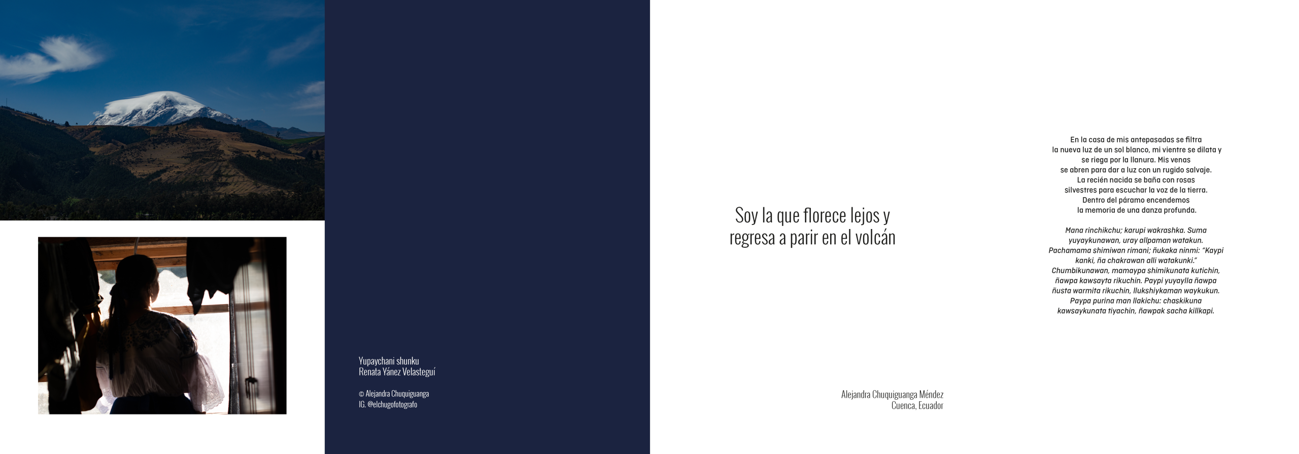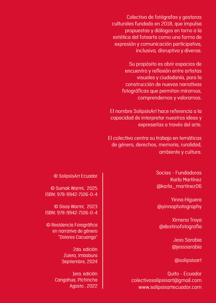 Fotolibro tejido en Zuleta, territorio Karanki, que sintetiza la experiencia colectiva de la 2da Residencia Fotográfica en Narrativa de Género “Dolores Cacuango”, donde doce fotógrafas de distintos países bordan memoria junto a las warmis y matronas de la comunidad. Desde una curaduría comunitaria y decolonial, la obra retrata una conversación visual que dignifica los saberes femeninos, la ruralidad, la cosmovisión andina y la relación de reciprocidad y cuidado con la Pachamama.